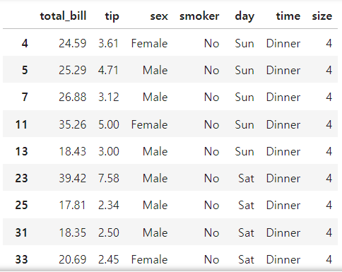 df.loc[df['size'] > 3, :] # size 컬럼의 값이 3 초과인 조건을 만족한 모든 데이터를 보여줘