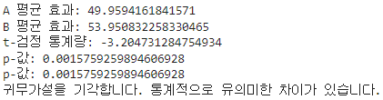 print("귀무가설을 기각합니다. 통계적으로 유의미한 차이가 있습니다.")