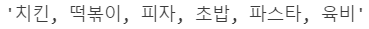 list = ['치킨', '떡볶이', '피자', '초밥', '파스타', '육비']