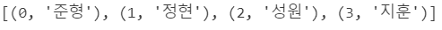 - 또한 index()는 중복값이 있는 경우 첫번째 값만 반환하기 때문에 중복된 값이 출력되며 인덱스를 매기고 싶을 때는 enumerate를 이용하면 됨