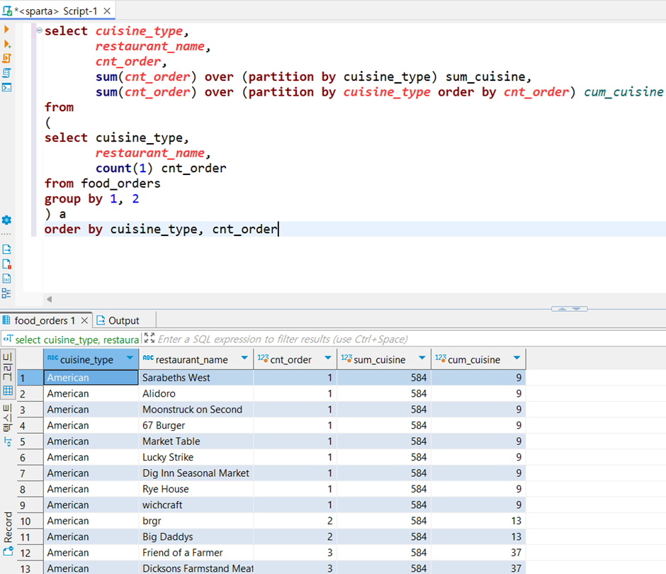 ▶ 그리고 누적합은 sum을 이용하여 구분하는 것까지 같지만 누적합이기 때문에 order by를 이용하여 순서대로 정렬해 더할 수 있도록 한다. 누적합 표시는 cum이라 표현한다.