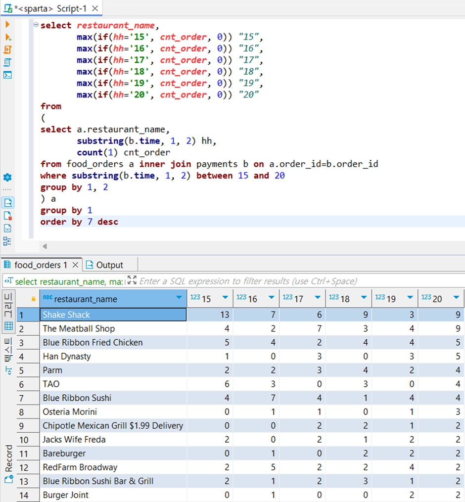 ▶ 그리고 정렬 기준이 20시 주문 건수를 기준으로 내림차순이라서, 7번째 줄에 20시에 대한 내용이 있어서 order_by 7 desc라고 작성한다. 끝!!